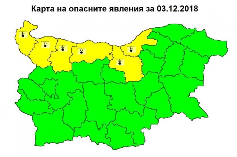 Жълт код за ниски температури е обявен в шест области в Северна България. Предупреждението е в сила за областите Видин, Враца, Монтана, Плевен, Велико Търново и Русе. Атмосферното налягане е по-високо от средното за декември - слабо ще се понижи.