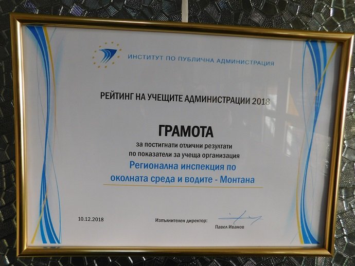 Въз основа на получените резултати Института по Публична администрация през м. декември подготви доклад и рейтинг на развитие на учещите администрации за 2018 г.. В тази класация РИОСВ – Монтана бе подредена на 5 – то място с резултат, по - висок от международния стандарт за самооценка чрез въпросника „Учеща ли е вашата организация?“.