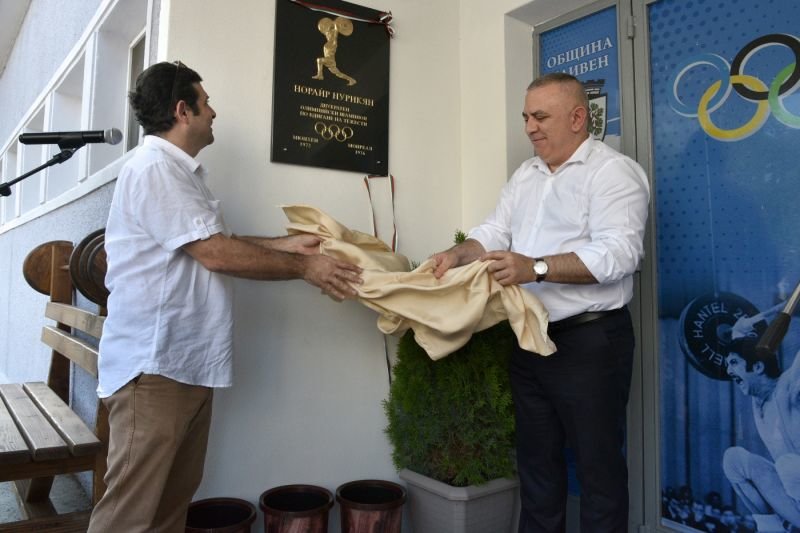 Кметът Стефан Радев и синът на Норайр Нурикян – Арам откриха паметна плоча на двукратния олимпийски шампион по вдигане на тежести, която се намира на входа на едноименната зала по щанги в Сливен.