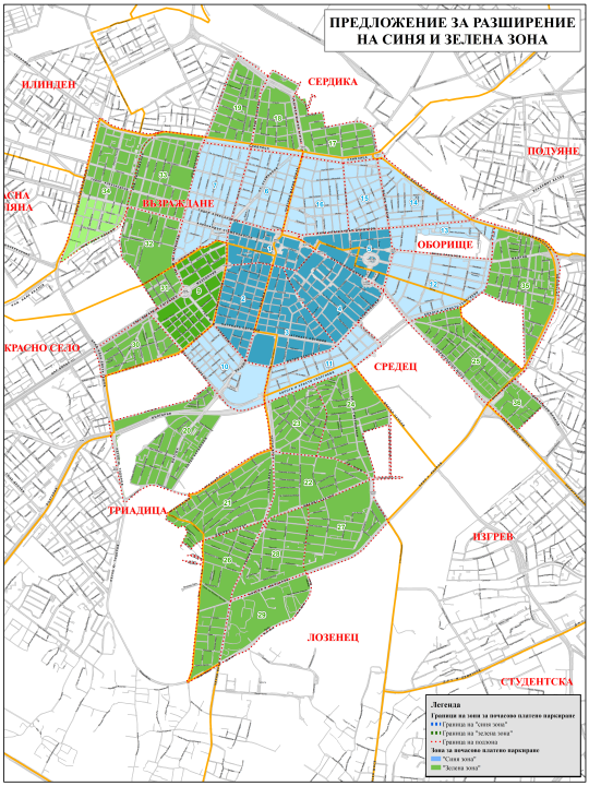 Столична община се готви да разшири двойно обхвата на синята и зелената зона за платено паркиране в София. Замисълът е големи части от зелената зона да преминат към синята. Планира се да се сложи край безплатния служебен абонамент и възможности за временно паркиране на собственици на фирми, магазини, хотели и на живущи. Предложенията за промени в Наредбата за организация на движението на територията на Столична община са на общинските съветници от ГЕРБ-СДС.