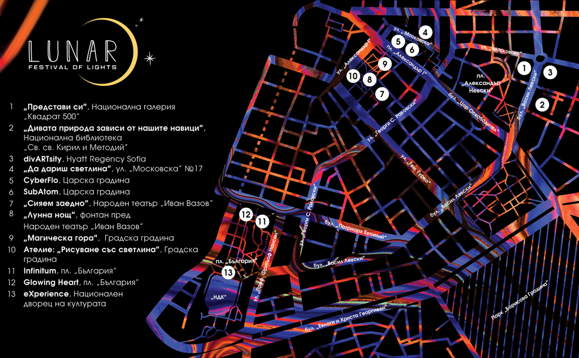 Първото издание на Фестивала на светлините LUNAR ще представи изкуството на талантливи артисти от Австралия, България, Индия, Испания, Франция и Швеция. Програмата на събитието включва различни видове произведения, които ще разкрият пред българската публика многообразието и силата на този вид изкуство. Всички творби ще могат да бъдат посетени безплатно, а светлините ще бъдат включени между 20:30 и 00:00 ч. във всяка от четирите вечери.