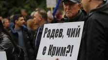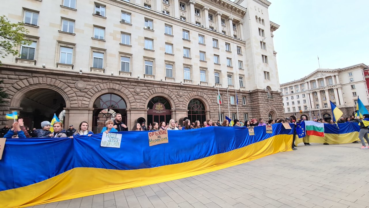 Мирният протест издигна десетки български и украински знамена, както и плакати, на които пише: „Радев – оставка! Нинова – оставка! Борисов – затвор!“, „Митрофанова, вън“, „Пълно ембарго на кървавия руски газ“, „Румен Радев = проруски сепаратист“, „ГАZ глава затрива“. Има и надписи, които носят украински граждани: „Херсонце“, „Save military from Azovstal”. Те освиркаха БСП и президента Румен Радев, и казаха, че според тях позицията на държавния глава е позорна.