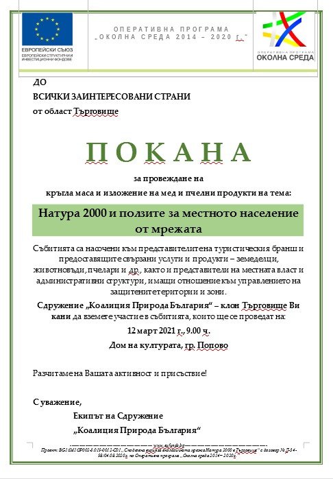 Сдружение „Коалиция Природа България“ - клон Търговище организира кръгла маса и изложение на мед и пчелни продукти на тема: „Натура 2000 и ползите за местното население от мрежата“.